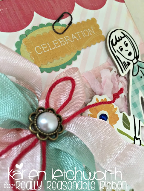 My bow includes a length of Bay Leaf Seam Binding, Baby Pink Seam Binding and Solid Red Baker's Twine.  I topped that with a Flower Shaped Acrylic Rhinestone from our fabulous Embellishments section. If you look closely at the photo above, you can see how that Bay Leaf Seam Binding perfectly matches the color on the chipboard girl's coat, and how the Baby Pink Seam Binding perfectly matches the fringe.  You see, Really Reasonable Ribbon carries SO many colors of everything that you're always SURE to find the perfect match for ALL your projects!