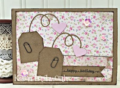 This first card is one that I created for Frantic Stamper. I had a lot of fun Guest Designing for them earlier this year. This card uses one of their brand new dies called Large Tea Bag Die from their May release. I cut it twice using kraft card stock, and inked them both. I added the heart from the same die-cut set, and then stamped a "happy birthday" sentiment from Frantic Stamper's brand new Many Happy Birthdays stamp set. I stamped the sentiment onto a flag that I cut with their sweet Flag Dies.