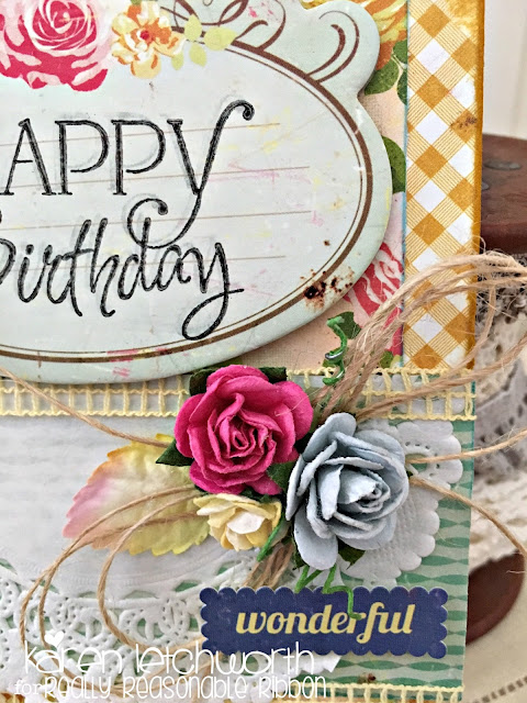 For this fun new Anything Goes Challenge, I chose to create a sweet card using some Crate Paper products (some of my faves), and of course.....LOTS of great Really Reasonable Ribbon goodies to adorn it! Once I inked and placed my patterned papers, I stamped a Happy Birthday sentiment on a coordinating piece of chipboard. Next, I added half of a white paper doily, and because Really Reasonable Ribbon has SO MANY FABULOUS Mulberry Flowers, I knew I could find the perfect colors to match my card.