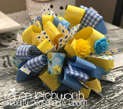 This sweet bow I'm sharing today includes a bit of each trim from this month's collection including a piece of 5/8" Plaid Ribbon in Capri Blue, 3/8" Diamond Satin Daffodil, 3/8" Yellow and Blue Confetti Dot Grosgrain Ribbon, 5/8" Capri Blue Taffeta Ribbon, 5/8" Yellow Poppy Print Satin Ribbon, 5/8" Daffodil Delicate Satin Stitched Ribbon, 3/8" Blue and Yellow Diamond Print Grosgrain Ribbon, 3/8" Capri Blue Checkerboard Ribbon, and 5/8" Satin Swirls Daffodil.