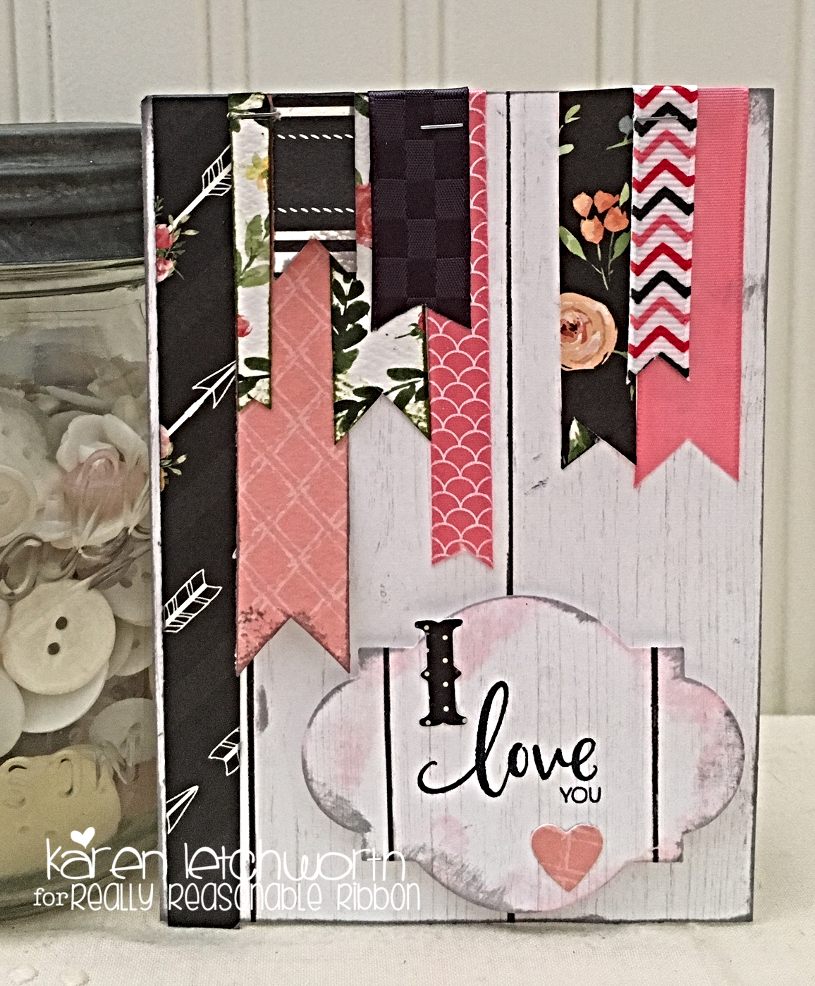 My second cards incorporates more of the grey and salmon tones in this sweet collection. And while, of course, I could have combined all the colors together; I really wanted to separate them out for you to show their incredible versatility. I cut strips of patterned papers as well as pieces of the gorgeous 3/8" Shell Print on Coral Rose Satin, 5/8" Charcoal Checkerboard, 5/8" Coral Rose Taffeta and the 3/8" Mixed Grey/Red Chevron Grosgrain Ribbon to my card to create the banners. I kept this very simple, and stamped a sentiment from the Farmhouse Scriptural Thoughts stamp set from Stamp Simply Clear Stamps that I attached with a few 3-D Foam Tabs to give it dimension.