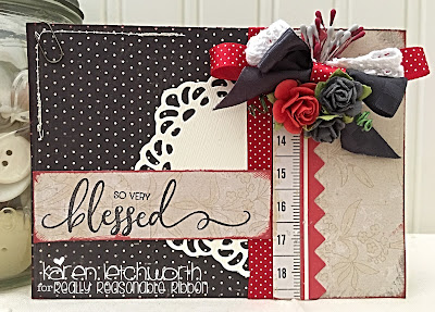 My first card uses the reds and greys found in this lovely collection. I attached my patterned papers together using strips of Scor-Tape, as well as some border stickers. Next, I added a piece of the 3/8" Red Satin Mini Swiss Dot Ribbon next to the border stickers. I also wanted a bow on my card, so I tied a length of the 5/8" Charcoal Checkerboard, and incorporated a piece of White Crochet Lace, and some 3/8" Red Satin Mini Swiss Dot to the bow. The finishing touches include some gorgeous Red Open Roses, Grey Open Roses, and Miniature Double-Head Stamens in grey and red, a touch of machine stitching and a mini paper clip.