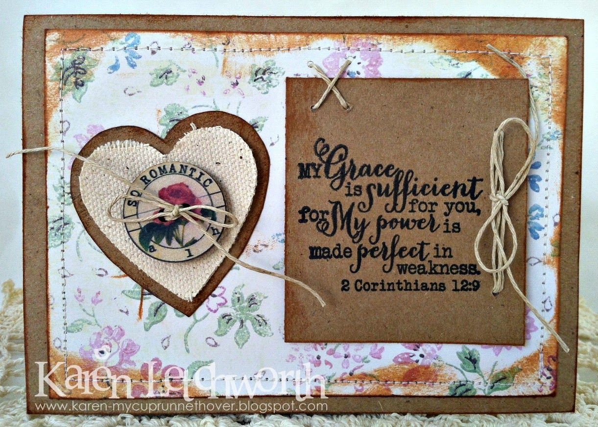 I was excited to use my punches for this week's challenge at The Kraft Journal Challenge Blog. I started this card with a Small Lunch Bag Kraft Note Card and attached a piece of floral patterned paper that I machine stitched onto the base. I used a small scrap of coordinating Lunch Bag Brown Coverweight Card Stock for my sentiment journaling area onto which I stamped a scripture sentiment using one of my favorite Bible verses. This lovely scripture stamp is from Verve Stamps new release. Next, I took a small hole punch and punched holes to thread through some Natural Hemp Cord to create a bow. I then used my small hole punch, and repeated this technique to create an X at the top. Next, I used another scrap of Lunch Bag Brown Coverweight Card Stock and a piece of Canvas to punch out hearts which I layered together. I added a sweet Prima wooden button to the heart layers, and again tied a bow using the Natural Hemp Cord.