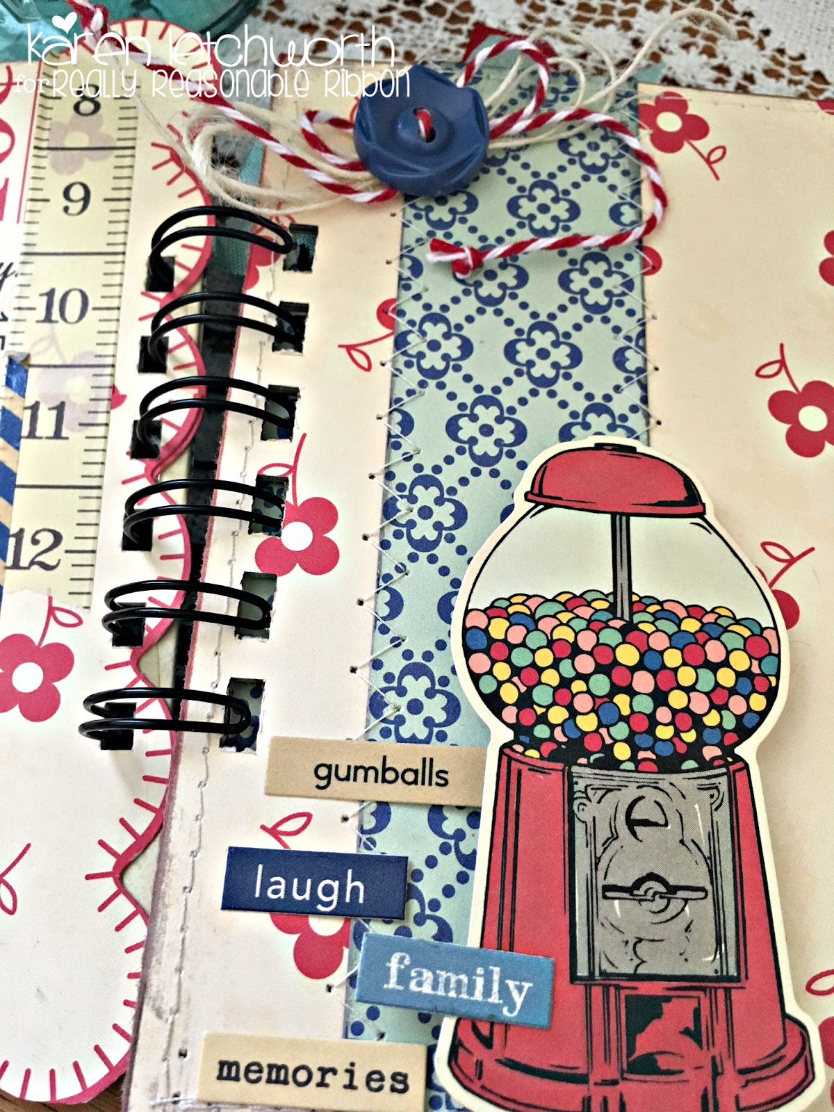 This reminds me so much of my Auntie Pam. She actually has a red antique gumball machine (the REAL version of this darling vintage sticker) on her kitchen counter. When her Grandkids (and others) come to her house, they can get some gumballs. This album is going to her so that she can put a picture of her gumball machine on this page, and place pictures of her Grandkids and other loved ones on the rest of pages.