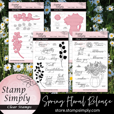 Woo Hoo!!  Over the next several weeks, we will be revealing and showcase the fabulous New Release at Stamp Simply Clear Stamps and you won't want to miss a thing.  Everything in this New Release is SO lovely, and that begins with the gorgeous new set I'm featuring today.  It's called Eucalyptus Silhouettes Stamp Set and it is absolutely DIVINE.I used two layers of basic white cardstock and I ran the second layer of it through my embossing machine using the Tim Holtz Lumber Embossing Folder to give some texture to my card.  The third layer is white watercolor paper that I stamped twice using the eucalyptus leaves found in the beautiful new Eucalyptus Silhouettes Stamp Set in greens.  Next, I stamped the eucalyptus leaves in teal colors and used the coordinating Eucalyptus Silhouettes Dies along with some 3-D foam tabs to raise up the teal stems.At the bottom of the eucalyptus leaves where all the stems come together, I added a bow with Black Baker's Twine.  This photo (above) is where you can see the embossing folder a bit better.  The beautiful sentiment I added is also found in the new Eucalyptus Silhouettes Stamp Set, and it is just one of nine (9) sentiments found in this lovely new set.  Here's a peek at the New Floral Release from Stamp Simply Clear Stamps.I would love to hear what you love most about these two new sets.  Next Monday I'll be sharing a card using the other new (Daisy) set.  I have some ideas brewing in my mind that I hope come to life as I hope they will.  I just LOVE the soft, flowing feeling of these eucalyptus branches, don't you?  They make it simple to create beautiful cards.