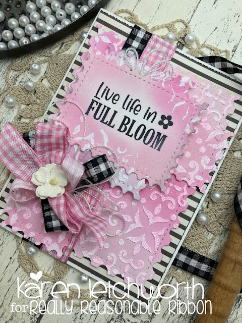 It's time for the EXCITING Really Reasonable Ribbon monthly Blog Hop; and for the Month of June, the theme is Summer and bright colors. One of the many things I love so much about Really Reasonable Ribbon is their wide variety of ribbons and trims. There's literally every style, every width, every texture and design, and....I could go on and on with more examples and I'd still forget to mention everything from this awesome store. You should have arrived here from Misty's Sweet Blog; but if not, you can catch the line-up on the RRR Blog. One lucky person who leaves a comment on each blog will WIN a $10 credit at Really Reasonable Ribbon AND a digital stamp set of choice from Bonnie Garby Designs. The card I'm sharing today features ribbons from RRR and a sentiment from Bonnie Garby Designs.I used white cardstock and one patterned paper. The other pieces that appear pink are white cardstock rubbed with Spun Sugar and Picked Berries Oxide Inks. I used Heavy Gesso and a cool Stencil to create my textured background. I sprinkled some pink glitter onto portions of the wet Gesso. I ran a length of Black & White Bold Check Ribbon and a piece of Medium Pink Gingham Ribbon down the left side of my card.The texture from the Heavy Gesso is lovely; especially dusted lightly with glitter. I tried to stencil more of it onto the sentiment pieces, but didn't want to cover the words on this delightful sentiment from Bonnie Garby Designs. It can be found in the Spring Digital Stamp Set. I also incorporated some White Iridescent String and some Light Gingham Ribbon into my bow. I topped it all with an Ivory Sweetheart Blossom.There are SO MANY great trims at Really Reasonable Ribbon in addition to Adhesives, Mulberry Flowers, Embellishments and much more. Your next and final stop on this Blog Hop is at the Really Reasonable Ribbon Blog where you'll answer the final question. However, please be sure that you've left a comment on each DT Member's Blog. Thanks so much for stopping by my blog today and have a great week.