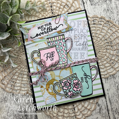 Aren't those patterned papers from the Coffee or Tea 6x6 Paper Pad super cool?  I especially love the dirty coffee rings.  I used the Fishtail Banner Dies to cut the sentiment strips.  I tied some Baker's Twine around my card as the finishing touch.  There are lots of great coffee sets available at Stamp Simply.  They carry just about every sentiment you can imagine, as well as beautiful images, stencils and so much more.